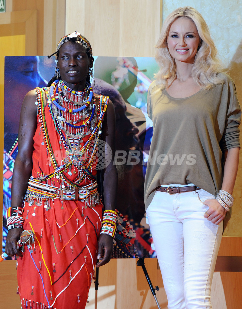 イベントには、マサイ族チーフのWilliam Kikanaeや、同コレクションのキャンペーンモデルを務めるスロバキア出身モデルのエイドリアナ・カランブー(Adriana Karembeu)が出席した。(c)AFP