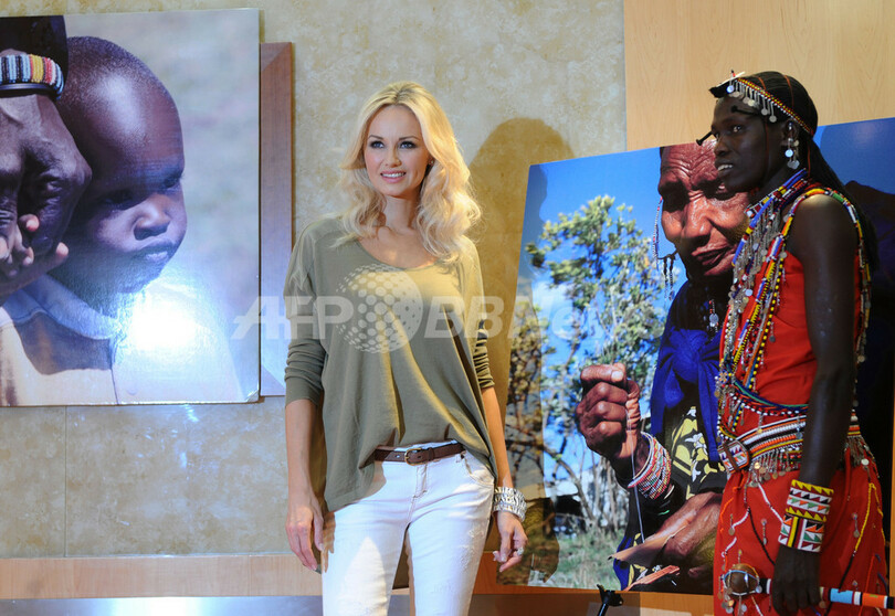 イベントには、マサイ族チーフのWilliam Kikanaeや、同コレクションのキャンペーンモデルを務めるスロバキア出身モデルのエイドリアナ・カランブー(Adriana Karembeu)が出席した。(c)AFP