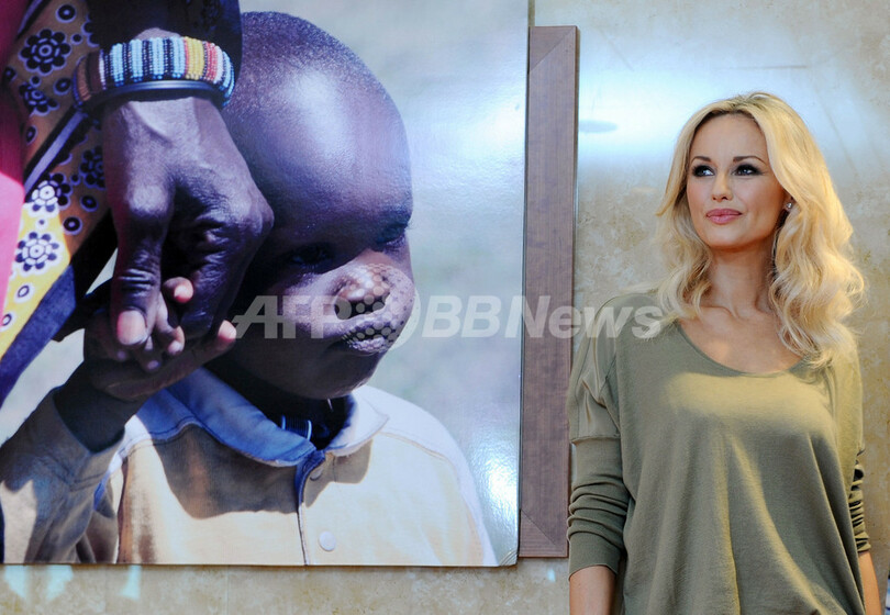 シューズブランド「ピコリーノス(Pikolinos)」とケニアのマサイ族(Masai)がコラボレーションした新作「PIKOLINOS MAASAI」の発表イベントに出席したモデルのエイドリアナ・カランブー(Adriana Karembeu、2011年2月1日撮影)。(c)AFP/DOMINIQUE FAGET
