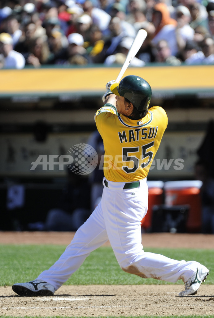 アスレチックスの松井秀喜(Hideki Matsui)は2回に左翼へ二塁打を放ち日米通算2500本安打を達成し、4打数2安打1打点だった。一方、マリナーズのイチロー(Ichiro Suzuki)は3打数1安打だった。(c)AFP