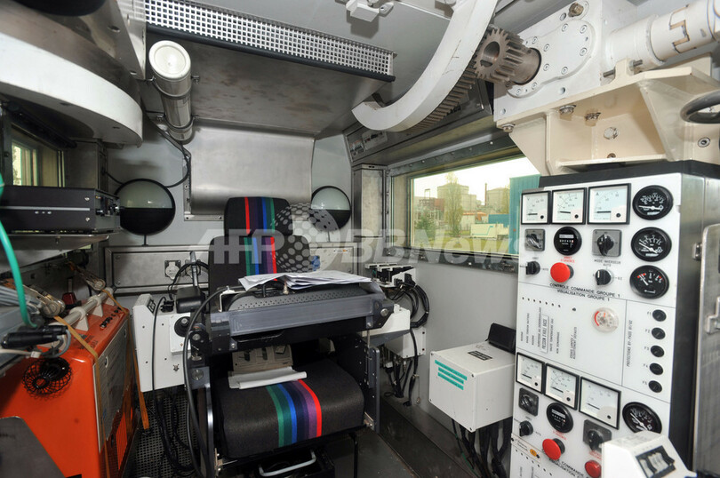 フランス中部シノン(Chinon)近郊のヴォワンヌ(Avoine)にあるフランス電力公社(EDF)原子力発電所内で撮影された作業用ロボットの操作ユニットの内部。INTRA(原子力事故ロボット工学的介入経済利益団体)が開発した。東京電力は、福島第1原発の事故を受け、EDFにも技術支援を要請している(2011年4月4日撮影)。(c)AFP/ALAIN JOCARD