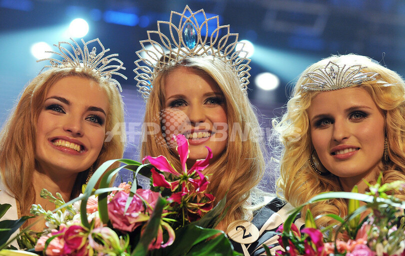 スロバキア東部の町ポプラト(Poprad)で9日、ミス・スロバキア(Miss Slovakia)2011の最終選考会が開催され、Michaela Nurcikovaさんが栄冠に輝いた。写真は、優勝したNurcikovaさん(中央)、2位のDusana Lukacovaさん(左)、3位のLubica Kvasnicovaさん(右、2011年4月9日撮影)。(c)AFP/JOE KLAMAR