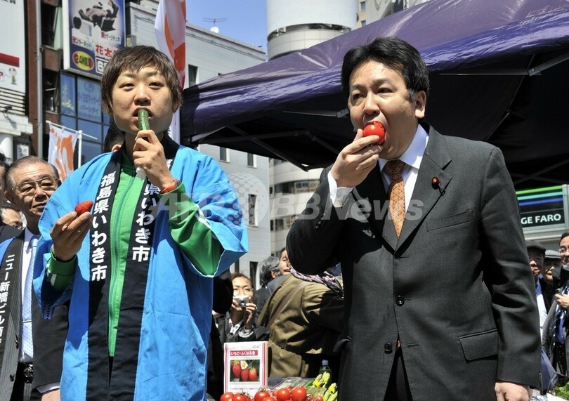 ニュース 政治・経済 枝野官房長官、いわき市産の野菜をガブリ 都内即売会 2011年4月12日 17:18 発信地:東京 [ アジア・オセアニア 東京 ] このニュースをシェア ‹ › ❮ 2/8 ❯ 都内即売会で福島県いわき市産のイチゴを食べる枝野幸男(Yukio Edano)官房長官(右)と、トマトを食べるお笑いコンビ南海キャンディーズのしずちゃんこと山崎静代(Shizuyo Yamasaki)さん(左、2011年4月12日撮影)。(c)AFP/Yoshikazu TSUNO 画像作成中 ! 【4月12日 AFP】福島第1原発事故で放射性物質が拡散したことの懸念から売上が落ちた福島県の農家を支援するため、枝野幸男(Yukio Edano)官房長官は12日、都内で開かれた即売会で、福島県いわき市で生産されたトマトやイチゴなどを食べ、安全性をアピールした。(c)AFP 政治・経済 一覧へ> メディア・報道関係・法人の方向け 写真・動画 購入のお問合せ>