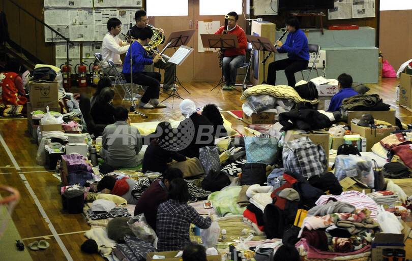 写真は、宮城県石巻市の避難所でコンサートを開く、仙台フィルハーモニー管弦楽団のメンバーたち(2011年4月14日撮影)。(c)AFP/TOSHIFUMI KITAMURA