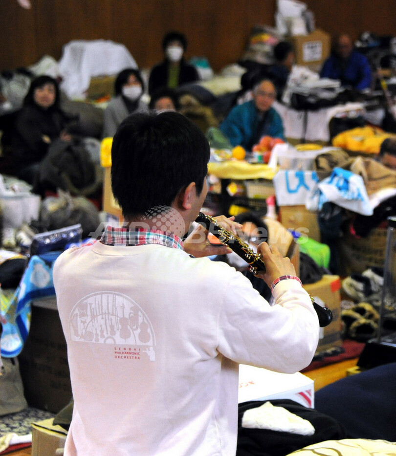 写真は、宮城県石巻市の避難所でコンサートを開く、仙台フィルハーモニー管弦楽団のメンバーたち(2011年4月14日撮影)。(c)AFP/TOSHIFUMI KITAMURA