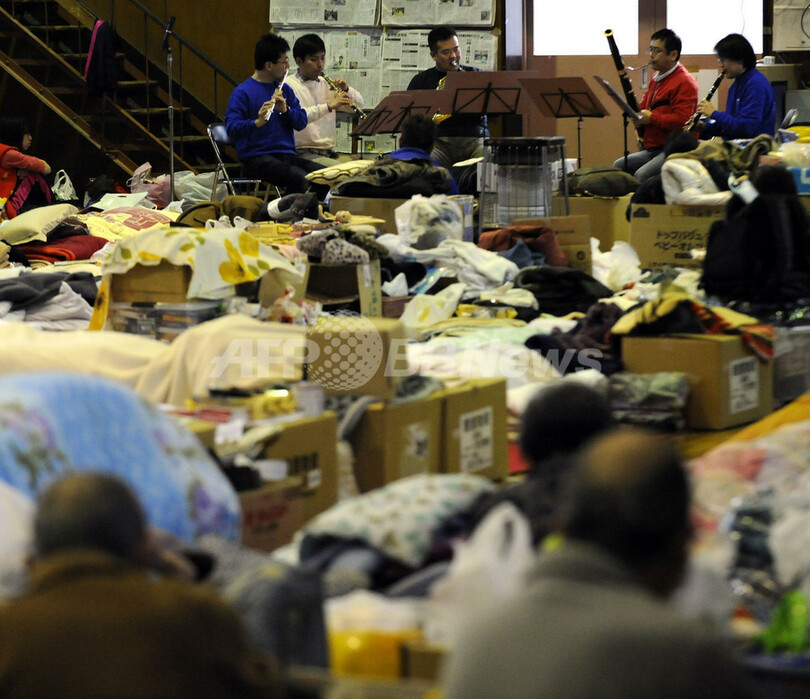 写真は、宮城県石巻市の避難所でコンサートを開く、仙台フィルハーモニー管弦楽団のメンバーたち(2011年4月14日撮影)。(c)AFP/TOSHIFUMI KITAMURA