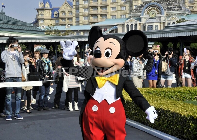 写真は、ゲストに手を振るミッキーマウス(Mickey Mouse、2011年4月15日撮影)。(c)AFP/Yoshikazu TSUNO