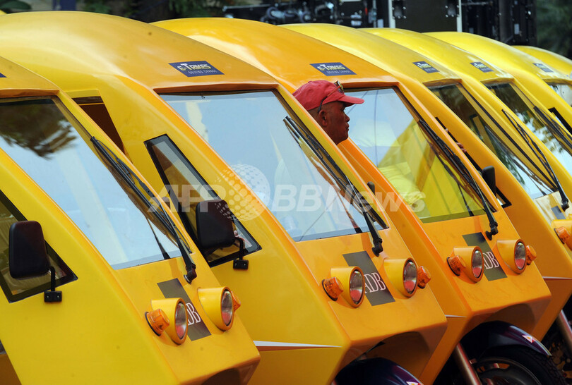 ニュース 環境・科学 三輪電気自動車、フィリピンの大気汚染対策に 2011年4月17日 11:27 発信地:マニラ/フィリピン [ アジア・オセアニア フィリピン ] このニュースをシェア ‹ › ❮ 4/6 ❯ フィリピン・マニラ(Manila)に並ぶ三輪電気自動車(2011年4月13日撮影)。(c)AFP/TED ALJIBE 画像作成中 ! 【4月17日 AFP】フィリピン・マニラ(Manila)で13日、新型の三輪電気自動車が披露された。フィリピンでは交通網による大気汚染を食い止めるため、人気のガソリン式三輪自動車の代替となる電気自動車の活用を進めている。(c)AFP 環境・科学 一覧へ> メディア・報道関係・法人の方向け 写真・動画 購入のお問合せ>