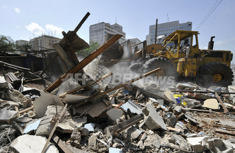 写真は、アビジャンの中心部プラトー(Plateau)地区ソルボンヌ(Sorbonne)で店舗を潰す重機。この付近にはバグボ氏を支持していた商店主が多く、バグボ氏派の若者が集会を開いていた。(2011年4月19日撮影)。(c)AFP/SIA KAMBOU
