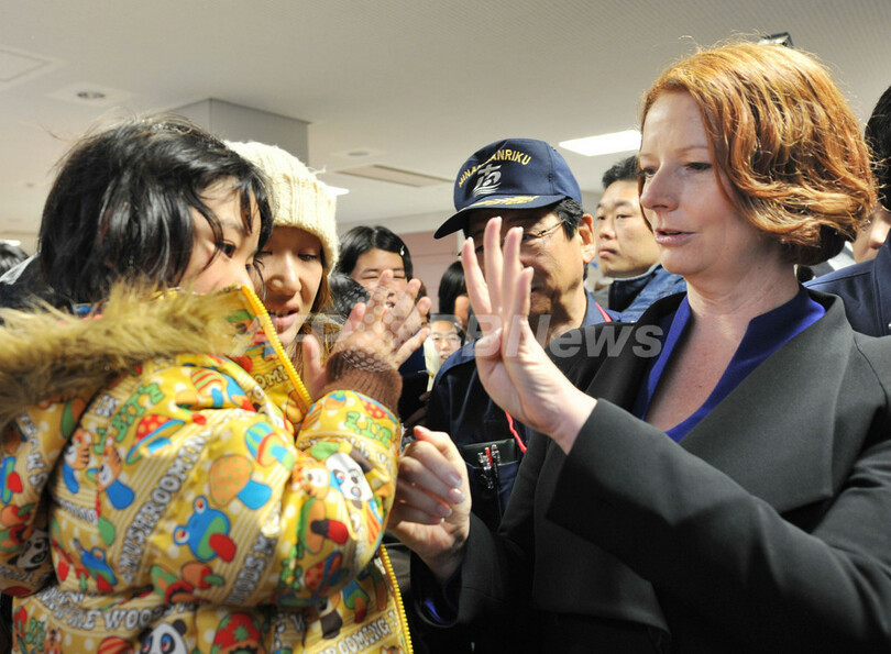 ニュース 政治・経済 ギラード豪首相、被災地の南三陸町を訪問 2011年4月23日 19:17 発信地:南三陸/宮城 [ アジア・オセアニア 宮城 ] このニュースをシェア ‹ › ❮ 18/21 ❯ 来日中のオーストラリアのジュリア・ギラード(Julia Gillard)首相は23日、東日本大震災で甚大な被害を受けた宮城県南三陸町を訪れた。ギラード首相は21日に復興支援への協力として、自然資源やレアアース(希土類)などの安定供給を約束した。写真は、南三陸町の避難所で、避難生活を送る子どもの歓迎を受けるギラード首相(2011年4月23日撮影)。(c)AFP/KAZUHIRO NOGI 画像作成中 ! 【4月23日 AFP】(写真追加)来日中のオーストラリアのジュリア・ギラード(Julia Gillard)首相は23日、東日本大震災で甚大な被害を受けた宮城県南三陸町を訪れた。ギラード首相は21日に復興支援への協力として、自然資源やレアアース(希土類)などの安定供給を約束した。(c)AFP 政治・経済 一覧へ> メディア・報道関係・法人の方向け 写真・動画 購入のお問合せ>