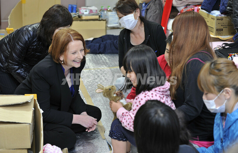ニュース 政治・経済 ギラード豪首相、被災地の南三陸町を訪問 2011年4月23日 19:17 発信地:南三陸/宮城 [ アジア・オセアニア 宮城 ] このニュースをシェア ‹ › ❮ 8/21 ❯ 来日中のオーストラリアのジュリア・ギラード(Julia Gillard)首相は23日、東日本大震災で甚大な被害を受けた宮城県南三陸町を訪れた。ギラード首相は21日に復興支援への協力として、自然資源やレアアース(希土類)などの安定供給を約束した。写真は、南三陸町の避難所で、避難生活を送る子どもたちにカンガルーのぬいぐるみをプレゼントするギラード首相(2011年4月23日撮影)。(c)AFP/KAZUHIRO NOGI 画像作成中 ! 【4月23日 AFP】(写真追加)来日中のオーストラリアのジュリア・ギラード(Julia Gillard)首相は23日、東日本大震災で甚大な被害を受けた宮城県南三陸町を訪れた。ギラード首相は21日に復興支援への協力として、自然資源やレアアース(希土類)などの安定供給を約束した。(c)AFP 政治・経済 一覧へ> メディア・報道関係・法人の方向け 写真・動画 購入のお問合せ>