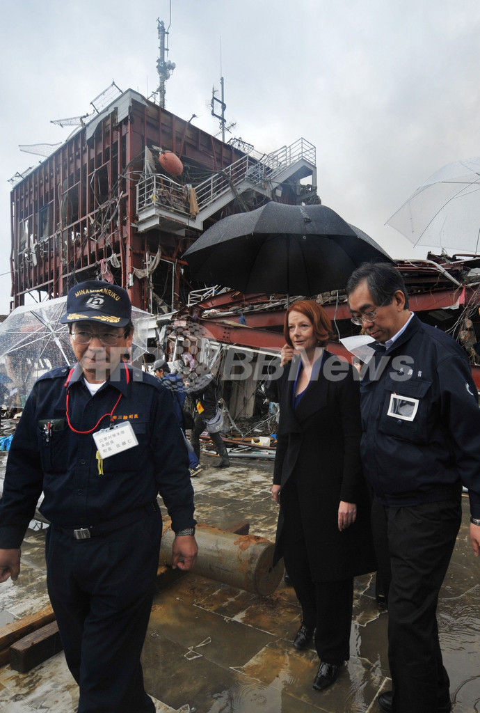ニュース 政治・経済 ギラード豪首相、被災地の南三陸町を訪問 2011年4月23日 19:17 発信地:南三陸/宮城 [ アジア・オセアニア 宮城 ] このニュースをシェア ‹ › ❮ 7/21 ❯ 来日中のオーストラリアのジュリア・ギラード(Julia Gillard)首相は23日、東日本大震災で甚大な被害を受けた宮城県南三陸町を訪れた。ギラード首相は21日に復興支援への協力として、自然資源やレアアース(希土類)などの安定供給を約束した。写真は、南三陸町を訪問したギラード首相(右2)と南三陸の佐藤仁(Jin Sato)町長(左、2011年4月23日撮影)。(c)AFP/KAZUHIRO NOGI 画像作成中 ! 【4月23日 AFP】(写真追加)来日中のオーストラリアのジュリア・ギラード(Julia Gillard)首相は23日、東日本大震災で甚大な被害を受けた宮城県南三陸町を訪れた。ギラード首相は21日に復興支援への協力として、自然資源やレアアース(希土類)などの安定供給を約束した。(c)AFP 政治・経済 一覧へ> メディア・報道関係・法人の方向け 写真・動画 購入のお問合せ>