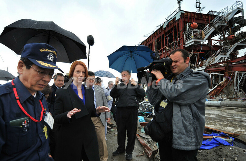 ニュース 政治・経済 ギラード豪首相、被災地の南三陸町を訪問 2011年4月23日 19:17 発信地:南三陸/宮城 [ アジア・オセアニア 宮城 ] このニュースをシェア ‹ › ❮ 6/21 ❯ 来日中のオーストラリアのジュリア・ギラード(Julia Gillard)首相は23日、東日本大震災で甚大な被害を受けた宮城県南三陸町を訪れた。ギラード首相は21日に復興支援への協力として、自然資源やレアアース(希土類)などの安定供給を約束した。写真は、南三陸町を訪問したギラード首相(左2)と南三陸の佐藤仁(Jin Sato)町長(左、2011年4月23日撮影)。(c)AFP/KAZUHIRO NOGI 画像作成中 ! 【4月23日 AFP】(写真追加)来日中のオーストラリアのジュリア・ギラード(Julia Gillard)首相は23日、東日本大震災で甚大な被害を受けた宮城県南三陸町を訪れた。ギラード首相は21日に復興支援への協力として、自然資源やレアアース(希土類)などの安定供給を約束した。(c)AFP 政治・経済 一覧へ> メディア・報道関係・法人の方向け 写真・動画 購入のお問合せ>