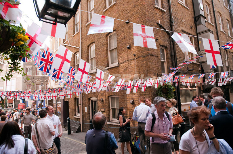 4月29日に行われる英国のウィリアム王子(Prince William)とケイト・ミドルトン(Kate Middleton)さんのロイヤルウエディングに向け、ロンドン(London)などでは準備が着々と進んでいる。写真は英国旗ユニオン・ジャックとイングランド旗で飾り付けられたパブの外(2011年4月21日撮影)。(c)AFP/LEON NEAL