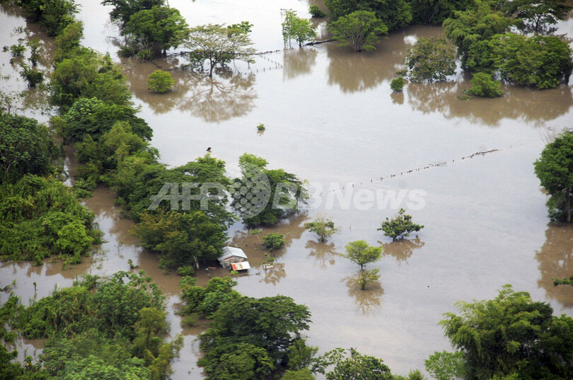 写真は、コロンビアのアンティオキア(Antioquia)州プエルト・ナレ(Puerto Nare)地区の洪水(2011年4月24日写真提供)。(c)AFP/Gobernacion de Antioquia