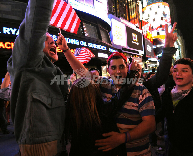 写真は、ニューヨーク(New York)のタイムズスクエア(Times Square)で喜ぶ人びと(2011年5月2日撮影)。(c)AFP/TIMOTHY A. CLARY