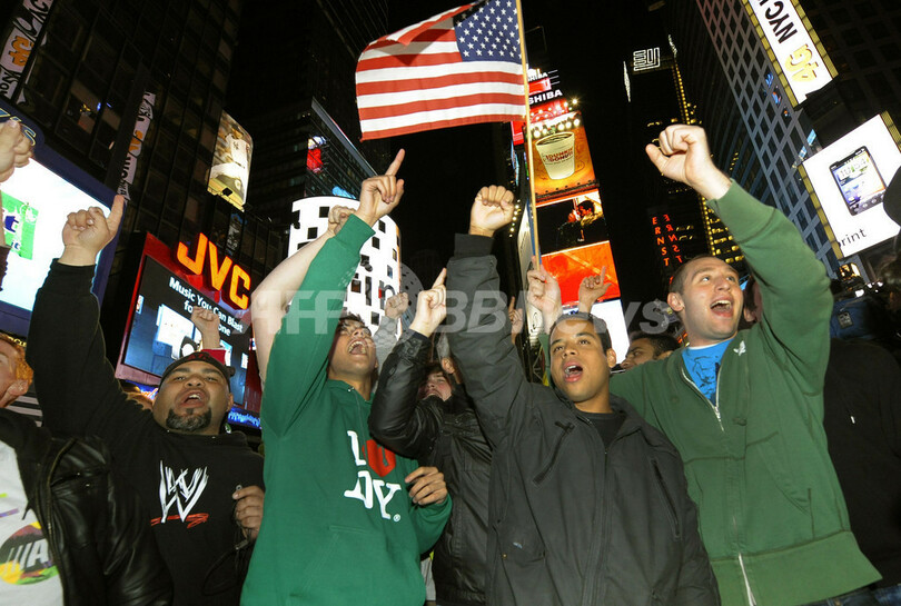 写真は、ニューヨーク(New York)のタイムズスクエア(Times Square)で喜ぶ人びと(2011年5月2日撮影)。(c)AFP/TIMOTHY A. CLARY