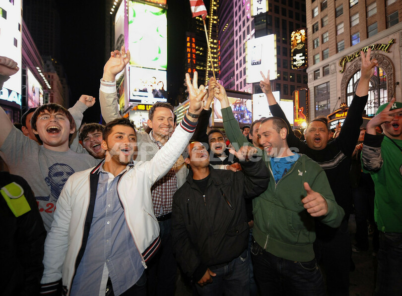 写真は、ニューヨーク(New York)のタイムズスクエア(Times Square)で喜ぶ人びと(2011年5月2日撮影)。(c)AFP/TIMOTHY A. CLARY