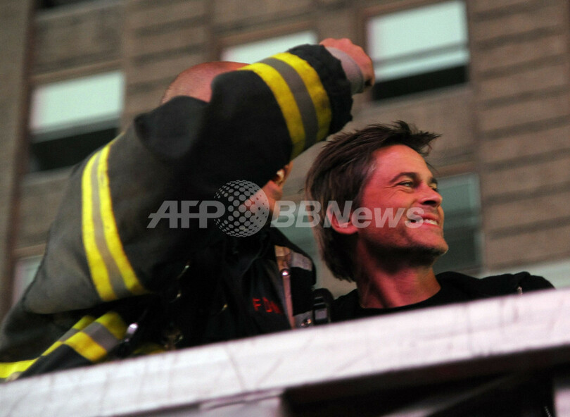 写真は、ビンラディン殺害の報をうけ、消防隊員とともに未明のニューヨーク(New York)・タイムズスクエア(Times Square)に姿を見せた俳優のロブ・ロウ(Rob Lowe)さん(2011年5月2日撮影)。(c)AFP/TIMOTHY A. CLARY