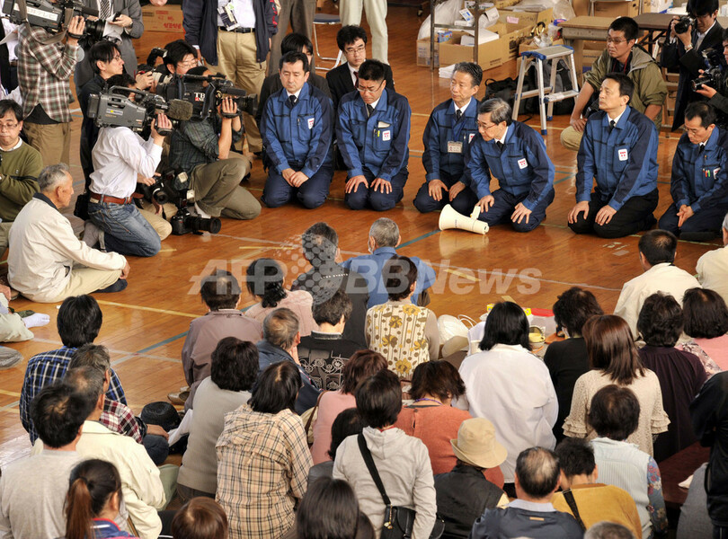 【5月4日 AFP】東京電力(TEPCO)の清水正孝(Masataka Shimizu)社長は4日、福島第1原子力発電所の事故により計画的避難区域に指定された福島県浪江町の住民が避難している同県二本松市の体育館を訪れ、住民らを前に土下座して謝罪した。