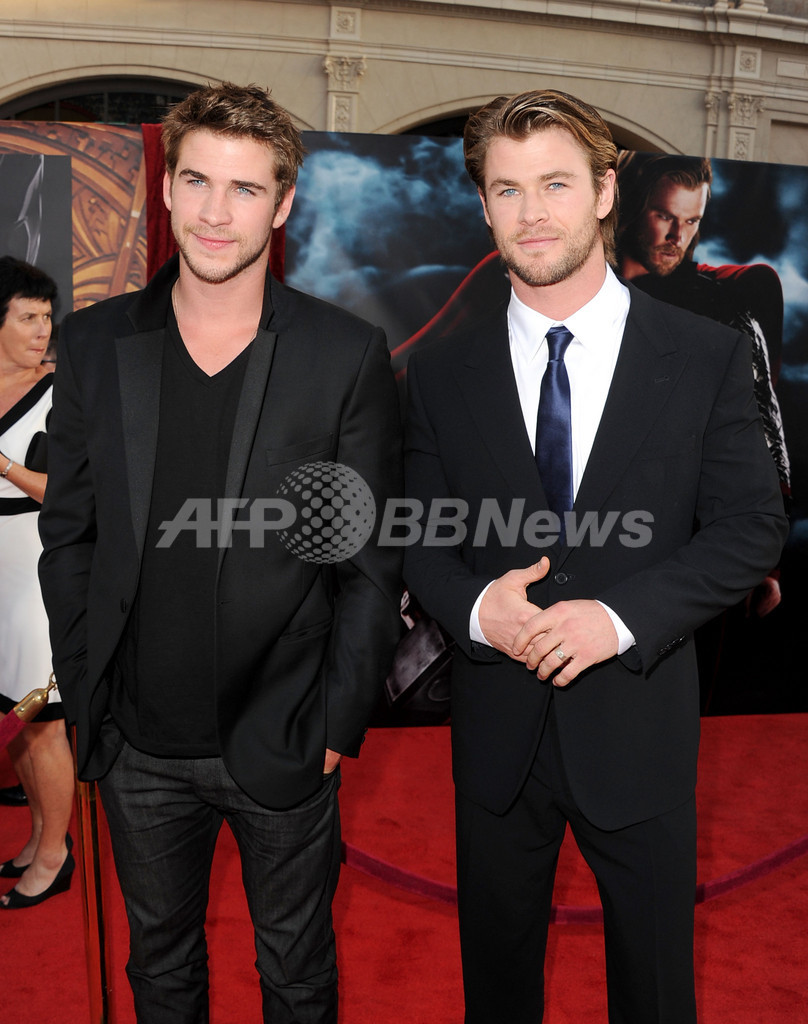 新作映画『マイティ・ソー(Thor)』のプレミア上映会が2日、米ロサンゼルス(Los Angeles)で開催され、出演している浅野忠信(Tadanobu Asano)らが出席した。日本公開は7月2日から。写真は、レッドカーペットに登場した主演のクリス・ヘムズワース(Chris Hemsworth、右)と兄のルーク・ヘムズワース(Luke Hemsworth、2011年5月2日撮影)。(c)AFP/Getty Images/Kevin Winter