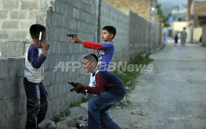 国際テロ組織アルカイダ(Al-Qaeda)の最高指導者ウサマ・ビンラディン(Osama Bin Laden)容疑者が殺害された、パキスタン・アボタバード(Abbottabad)の邸宅付近の路上で、プラスチック製の銃のおもちゃを持って遊ぶ子どもたち。ビンラディン容疑者の妻によると、同容疑者は5年ほど前から邸宅に潜伏していたという(2011年5月7日撮影)。(c)AFP/AAMIR QURESHI