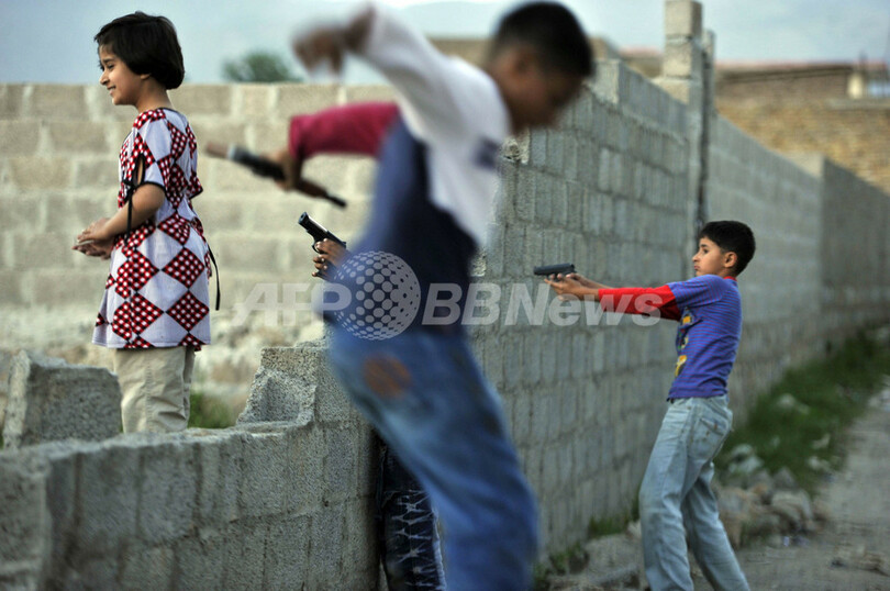 国際テロ組織アルカイダ(Al-Qaeda)の最高指導者ウサマ・ビンラディン(Osama Bin Laden)容疑者が殺害された、パキスタン・アボタバード(Abbottabad)の邸宅付近の路上で、プラスチック製の銃のおもちゃを持って遊ぶ子どもたち。ビンラディン容疑者の妻によると、同容疑者は5年ほど前から邸宅に潜伏していたという(2011年5月7日撮影)。(c)AFP/AAMIR QURESHI