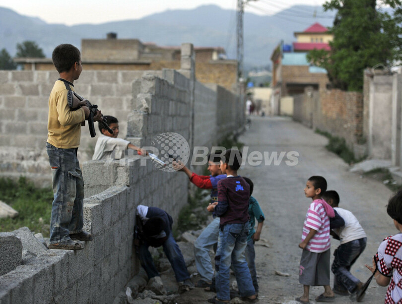 国際テロ組織アルカイダ(Al-Qaeda)の最高指導者ウサマ・ビンラディン(Osama Bin Laden)容疑者が殺害された、パキスタン・アボタバード(Abbottabad)の邸宅付近の路上で、プラスチック製の銃のおもちゃを持って遊ぶ子どもたち。ビンラディン容疑者の妻によると、同容疑者は5年ほど前から邸宅に潜伏していたという(2011年5月7日撮影)。(c)AFP/AAMIR QURESHI