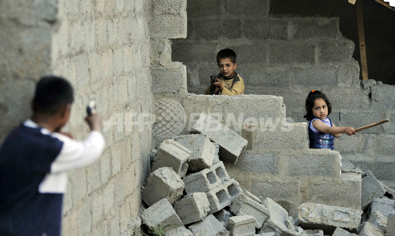 国際テロ組織アルカイダ(Al-Qaeda)の最高指導者ウサマ・ビンラディン(Osama Bin Laden)容疑者が殺害された、パキスタン・アボタバード(Abbottabad)の邸宅付近の路上で、プラスチック製の銃のおもちゃを持って遊ぶ子どもたち。ビンラディン容疑者の妻によると、同容疑者は5年ほど前から邸宅に潜伏していたという(2011年5月7日撮影)。(c)AFP/AAMIR QURESHI