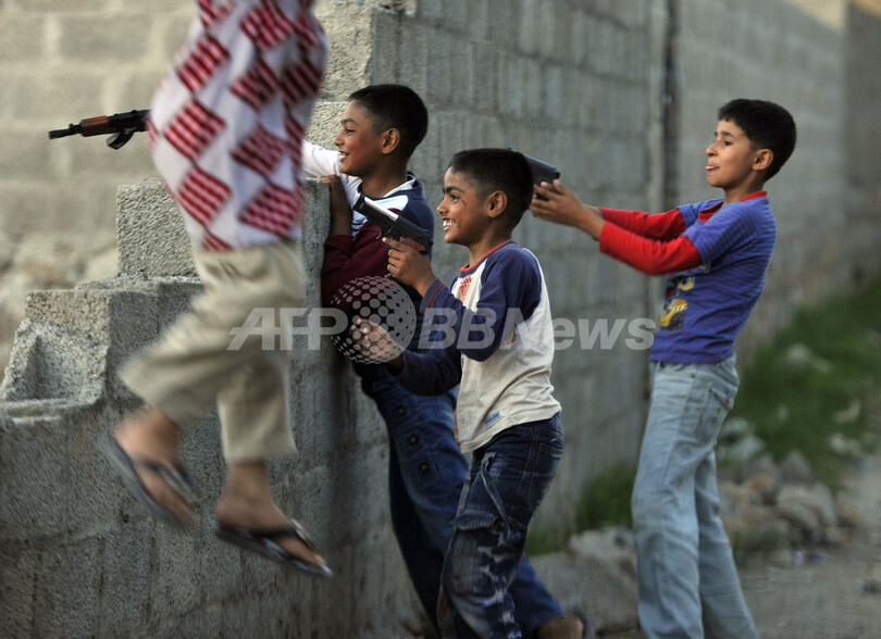 国際テロ組織アルカイダ(Al-Qaeda)の最高指導者ウサマ・ビンラディン(Osama Bin Laden)容疑者が殺害された、パキスタン・アボタバード(Abbottabad)の邸宅付近の路上で、プラスチック製の銃のおもちゃを持って遊ぶ子どもたち。ビンラディン容疑者の妻によると、同容疑者は5年ほど前から邸宅に潜伏していたという(2011年5月7日撮影)。(c)AFP/AAMIR QURESHI
