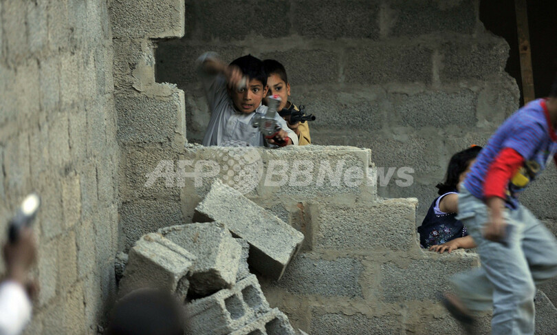 国際テロ組織アルカイダ(Al-Qaeda)の最高指導者ウサマ・ビンラディン(Osama Bin Laden)容疑者が殺害された、パキスタン・アボタバード(Abbottabad)の邸宅付近の路上で、プラスチック製の銃のおもちゃを持って遊ぶ子どもたち。ビンラディン容疑者の妻によると、同容疑者は5年ほど前から邸宅に潜伏していたという(2011年5月7日撮影)。(c)AFP/AAMIR QURESHI