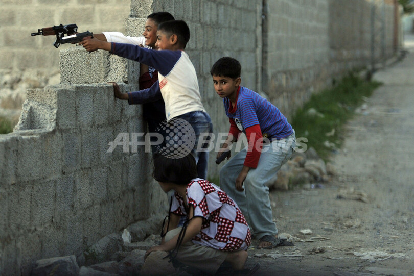 国際テロ組織アルカイダ(Al-Qaeda)の最高指導者ウサマ・ビンラディン(Osama Bin Laden)容疑者が殺害された、パキスタン・アボタバード(Abbottabad)の邸宅付近の路上で、プラスチック製の銃のおもちゃを持って遊ぶ子どもたち。ビンラディン容疑者の妻によると、同容疑者は5年ほど前から邸宅に潜伏していたという(2011年5月7日撮影)。(c)AFP/AAMIR QURESHI