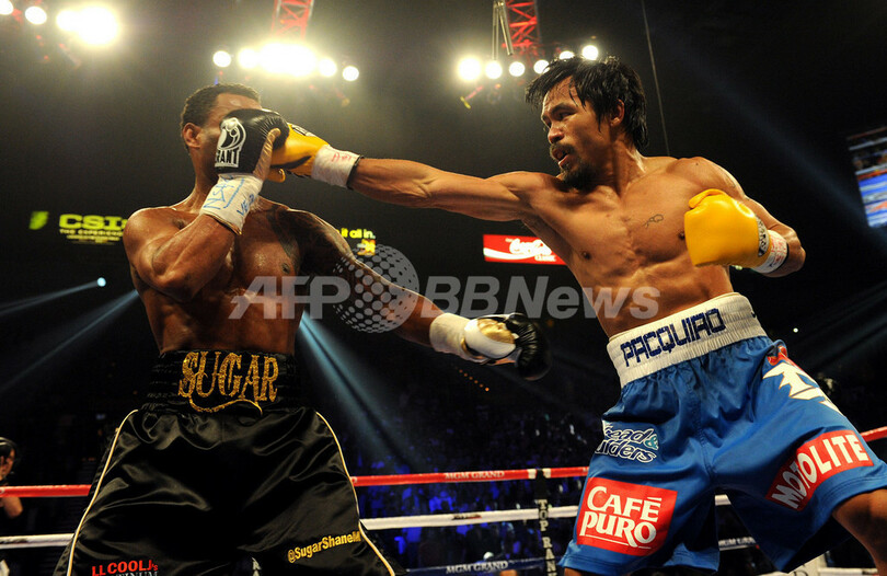 【5月8日 AFP】ボクシング、WBO世界ウェルター級タイトルマッチ12回戦は7日、ネバダ(Nevada)州ラスベガス(Las Vegas)のMGMグランドアリーナ(MGM Grand Arena)で行われ、王者マニー・パッキャオ(Manny Pacquiao、フィリピン)はシェーン・モズリー(Shane Mosley、米国)と対戦。パッキャオは判定の結果3-0(119-108、120-108、120-107)でモズリーを下して王座を防衛、連勝を14に伸ばした。(c)AFP/Greg Heakes