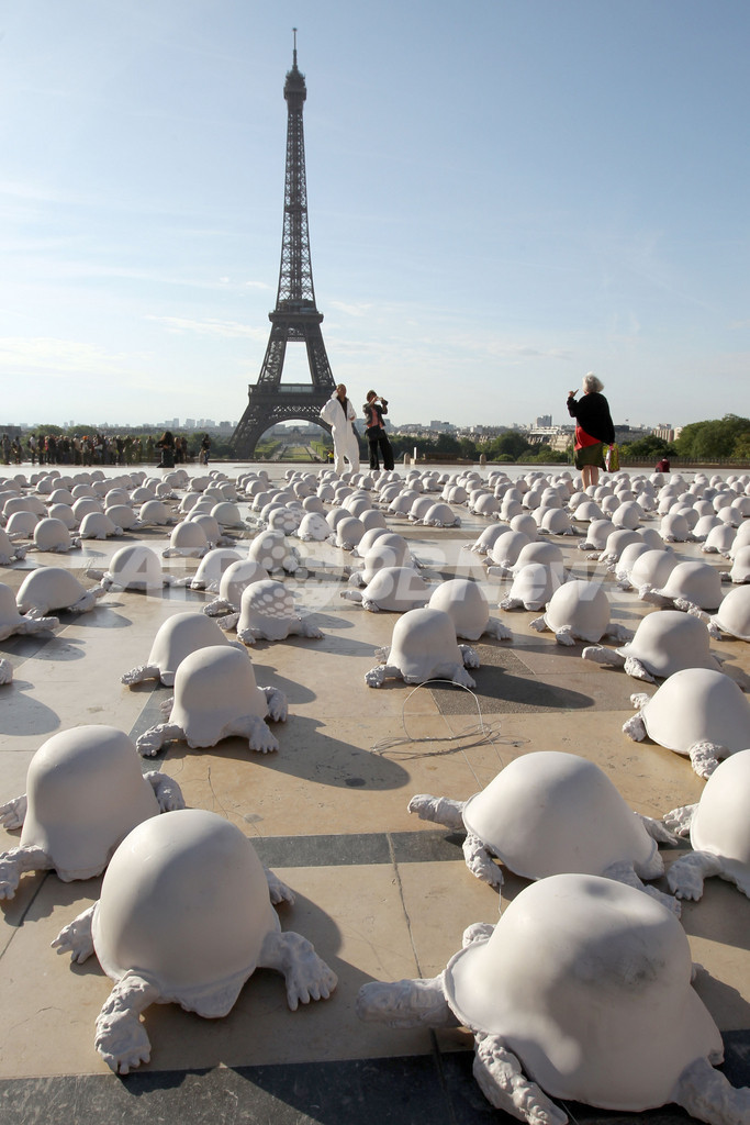 【5月10日 AFP】パリ(Paris)のトロカデロ(Trocadero)で8日、第2次世界大戦(World War II)の連合国の対独戦勝から66周年になるのを記念して、カメの形をした1000点の作品が並べられた。フランスのアーティスト、ラシド・キモーン(Rachid Khimoune)氏が90年代の各国のヘルメットを使って製作したもので、決して終わらない戦争の恐怖を表現している。(c)AFP
