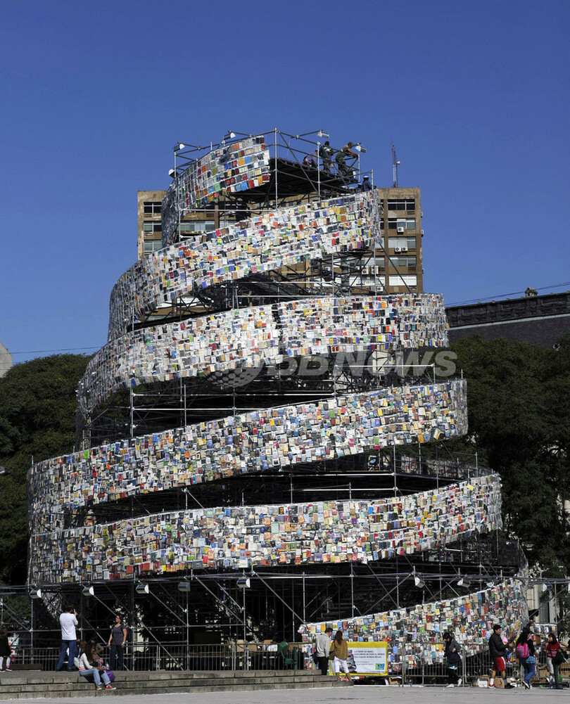 【5月9日 AFP】アルゼンチンのアーティスト、マルタ・ミヌヒン(Marta Minujin)氏が、首都ブエノスアイレス(Buenos Aires)のサンマルチン広場(San Martin square)に、各国語の本数千冊を使って作り上げた作品「バベルの塔(Tower of Babel)」。ブエノスアイレスはユネスコ(UNESCO)の「World Book Capital 2011(2011年世界書籍首都)」にノミネートされている。(c)AFP