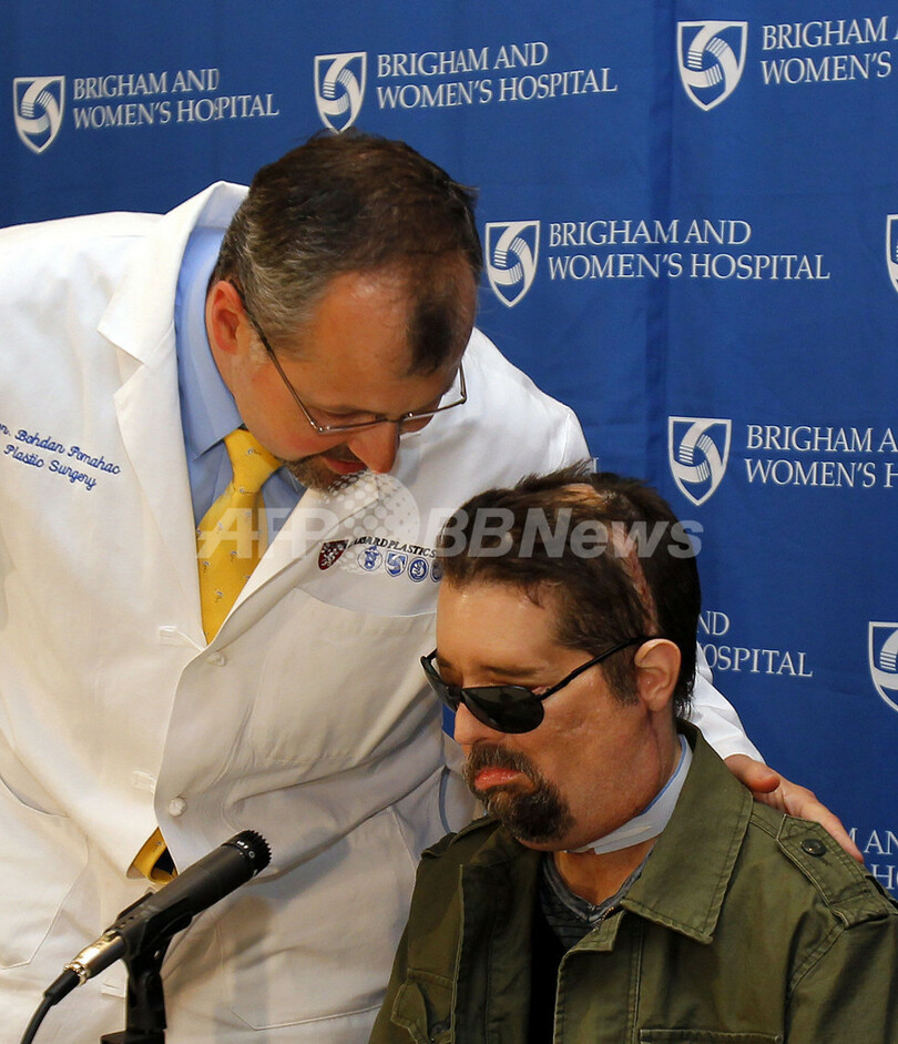 【5月10日 AFP】米ボストン(Boston)の病院で3月に同国初の全顔面移植術を受けた男性が9日、新しい顔で会見に臨んだ。
