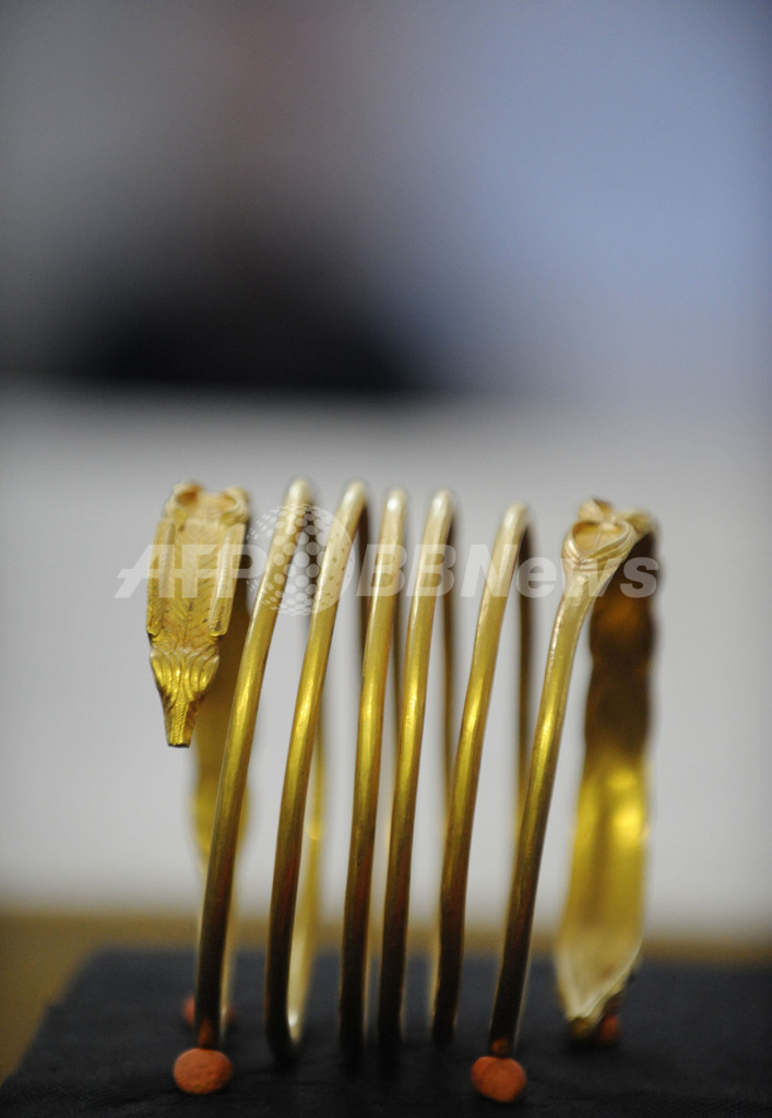 このうち、933グラムの黄金のブレスレットは、リュシマコス(Lysimachus、紀元前355-281年)の時代にカルパチア山脈(Carpathian Mountains)周辺に住んでいた古代ダキア人のもので、1998年~2001年の間に24点が盗まれた。11点が依然として行方不明だという。(c)AFP