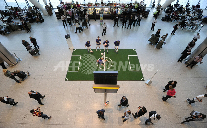【5月13日 AFP】サッカー欧州チャンピオンズリーグ2010-11(UEFA Champions League 2010-11)の決勝を2週間後に控えた12日、英ロンドン(London)近郊のヒースロー(Heathrow)空港でフリースタイル・フットボールの選手によるパフォーマンスが行われた。チャンピオンズリーグの女子サッカー決勝は26日、男子決勝は28日にロンドンのウェンブリー・ スタジアム(Wembley Stadium)で行われる。(c)AFP
