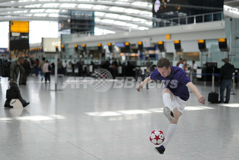 【5月13日 AFP】サッカー欧州チャンピオンズリーグ2010-11(UEFA Champions League 2010-11)の決勝を2週間後に控えた12日、英ロンドン(London)近郊のヒースロー(Heathrow)空港でフリースタイル・フットボールの選手によるパフォーマンスが行われた。チャンピオンズリーグの女子サッカー決勝は26日、男子決勝は28日にロンドンのウェンブリー・ スタジアム(Wembley Stadium)で行われる。(c)AFP