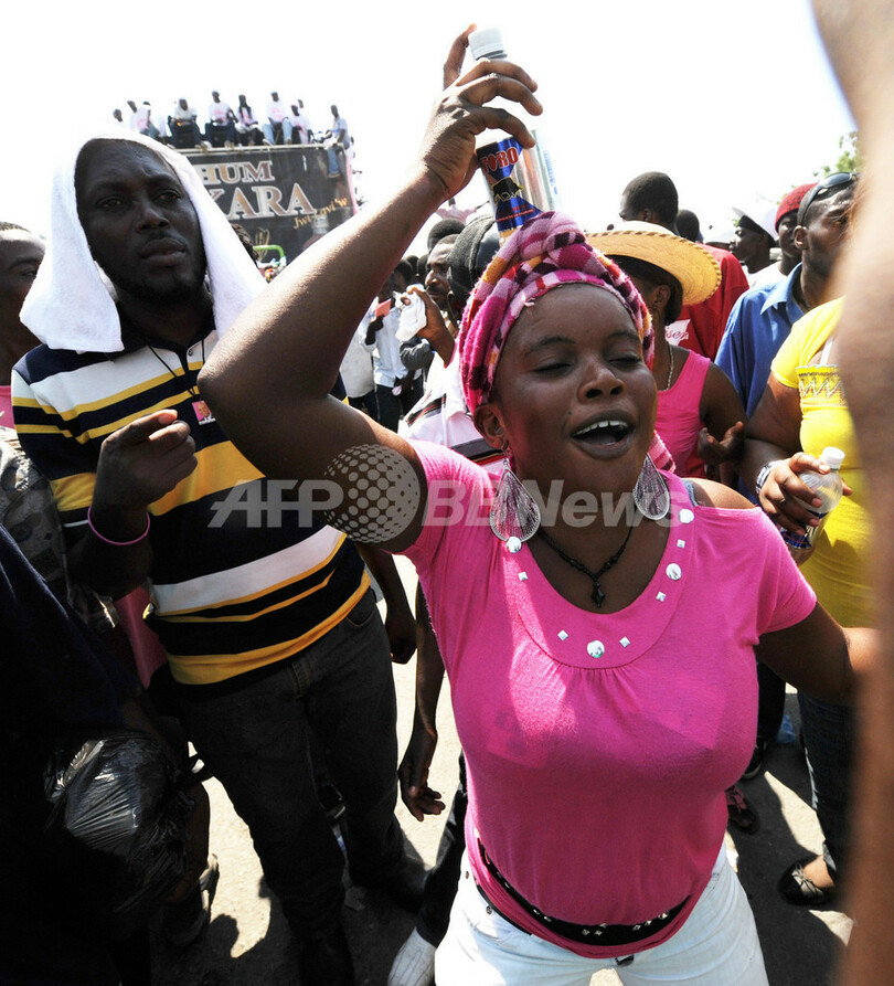 写真は、路上でマーテリー新大統領の就任を喜ぶ国民(2011年5月14日撮影)。(c)AFP/Thony BELIZAIRE