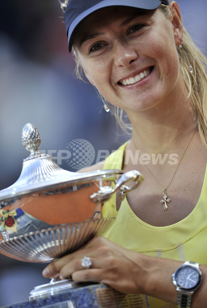 昨年5月のストラスブール国際(Internationaux de Strasbourg 2010)以来の優勝を果たしたシャラポワは、開幕間近の全仏オープンテニス2011(French Open 2011)に向けて弾みをつけた。シャラポワは、4大大会(グランドスラム)では唯一全仏のタイトルのみ獲得できていない。(c)AFP/Barnaby Chesterman