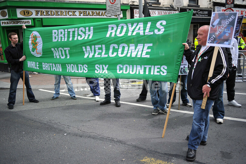 だが、おごそかな雰囲気とは対照的に、警官隊に阻まれ数百メートル離れた場所に集まった共和主義のデモ隊数百人がシュプレヒコールを上げ、英国旗に火を付けるなどして女王訪問に抗議した。