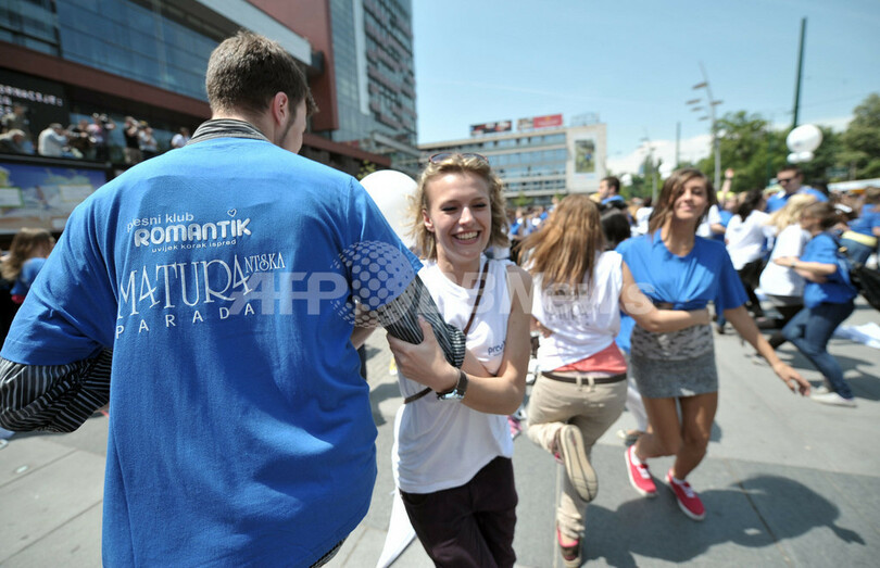 ボスニア・ヘルツェゴビナでは、首都サラエボ(Sarajevo)など国内8都市で、ことし卒業する高校生4500人がヨハン・シュトラウス作曲の「こうもりのカドリール(Fledermauss-Quadrille)」を踊った。(c)AFP