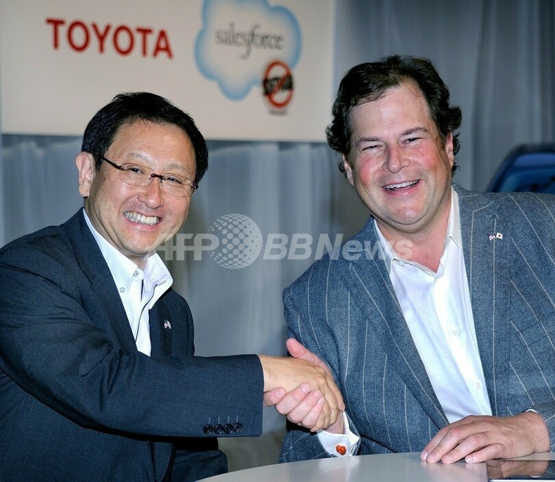 トヨタとセールスフォースは、トヨタの顧客向けIT事業会社トヨタメディアサービス(Toyota Media Service)に、トヨタが4億4200万円を出資し、セールスフォースが2億2300万円を出資する。また、4月にトヨタと戦略的パートナーシップを発表したマイクロソフト(Microsoft)もトヨタメディアサービスに3億3500万円を出資する。(c)AFP