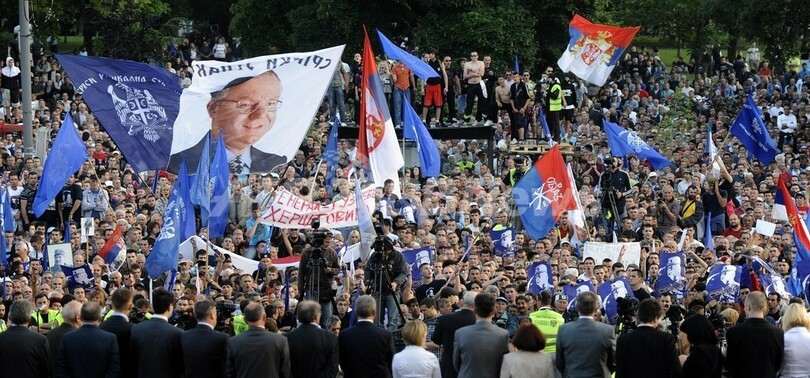 極右民族派セルビア急進党(Serbian Radical Party)のボイスラフ・ シェシェリ(Vojislav Seselj)党首のポスターを掲げ、国連(UN)の旧ユーゴスラビア国際戦犯法廷(International Criminal Tribunal for the former Yugoslavia、ICTY)に起訴されたラトコ・ムラディッチ(Ratko Mladic)被告の身柄拘束に抗議する右派の人々(2011年5月29日撮影)。(c)AFP/ANDREJ ISAKOVIC