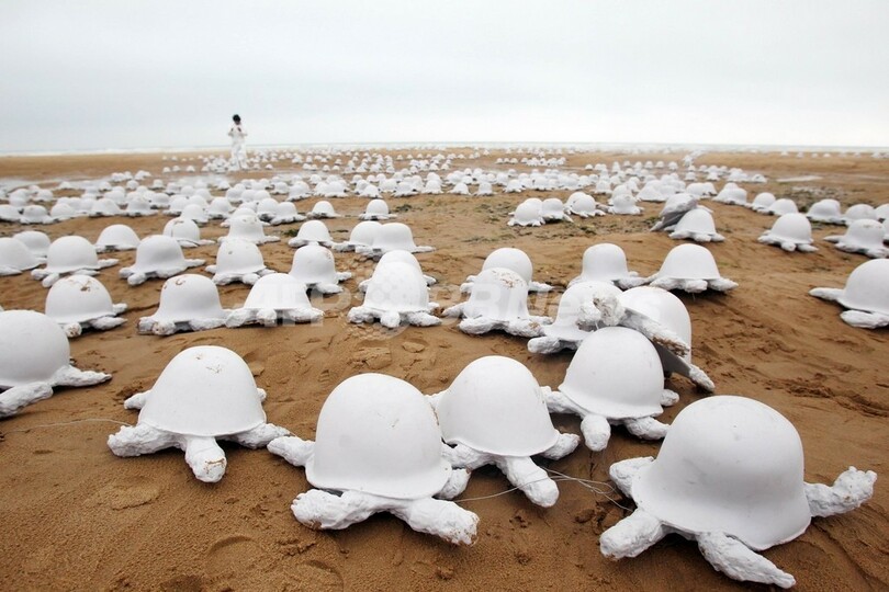 【6月6日 AFP】第2次世界大戦(World War II)中のノルマンディー(Normandy)上陸作戦決行日「Dデー(D-Day)」から6日で67周年を迎えるのを記念して、各国軍のヘルメットから作られたカメの形のオブジェ1000点が、仏ノルマンディー地方のコルビルシュルメール(Colleville-sur-Mer)の浜辺に展示された。フランスのアーティスト、ラシド・キモーン(Rachid Khimoune)氏による作品で、「決して終わらない戦争の恐怖」を表現している。(c)AFP