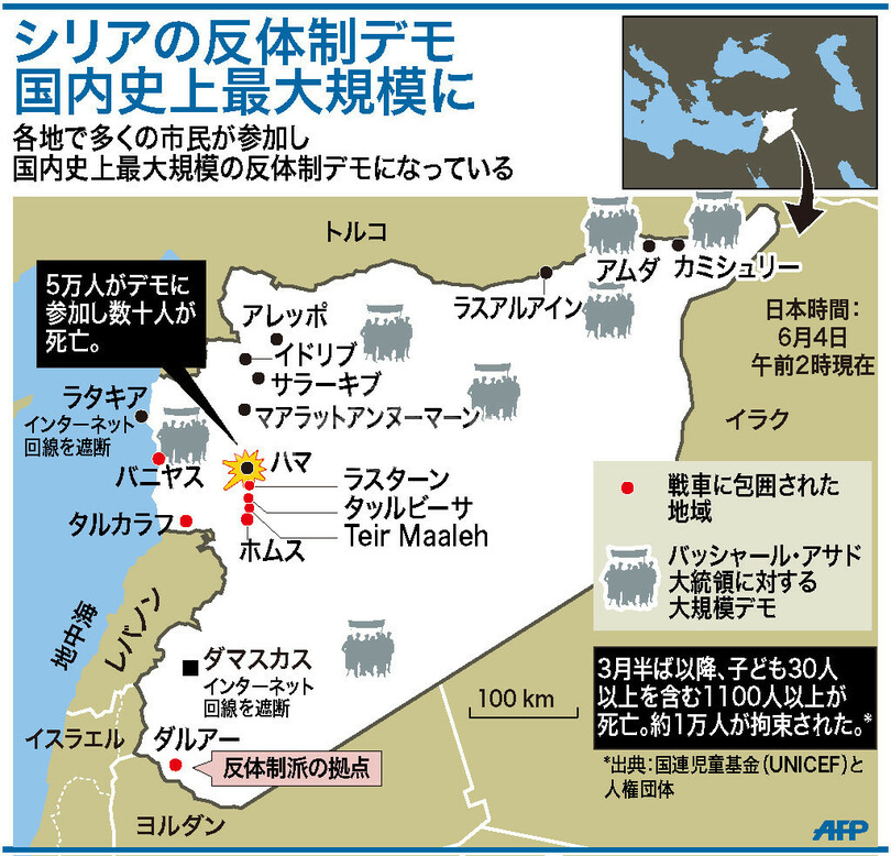 ニュース 戦争・紛争 図解 【図解】シリアの反体制デモ、国内史上最大規模に 2011年6月6日 17:16 発信地:シリア [ 中東・北アフリカ シリア ] このニュースをシェア (c)AFP 【6月6日 AFP】図は、反体制デモが続く中東シリアについて示したもの。(c)AFP<ニュース解説画像一覧へ> 戦争・紛争 一覧へ> メディア・報道関係・法人の方向け 写真・動画 購入のお問合せ>