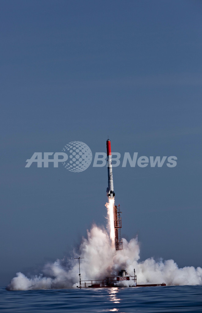 目標は人間サイズの人形を乗せたロケットを、15~16キロ上空まで打ち上げることだったが、この日の実験では2.8キロまでしか上昇せず、飛行距離もわずか8.5キロだった。(c)AFP