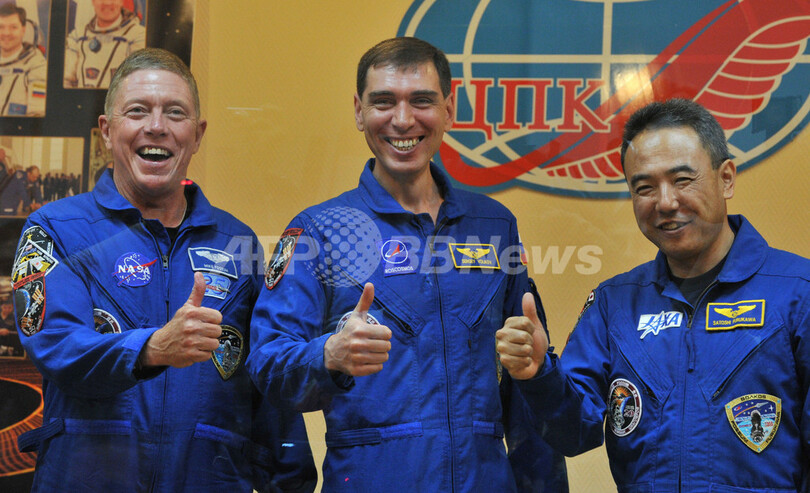 ソユーズには、ほかにも米国人のマイケル・フォッサム(Mike Fossum)飛行士とロシア人のセルゲイ・ボルコフ(Sergei Volkov)飛行士が搭乗している。(c)AFP
