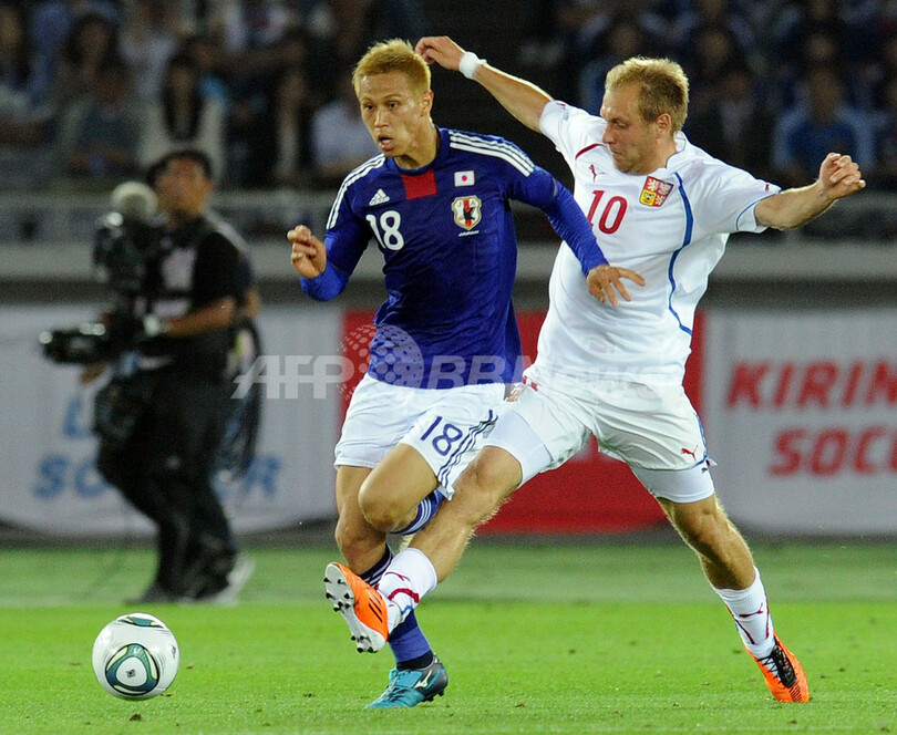 写真は、日本対チェコ。チェコのダニエル・コラージ(Daniel Kolar、右)のチェックを受ける本田圭佑(Keisuke Honda、2011年6月7日撮影)。(c)AFP/TOSHIFUMI KITAMURA